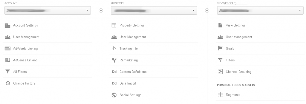 Step 3. It will show you a dashboard similar to the image below. Use the menus – which you can see on top of the columns, to select account, property or view you want. To add someone at the account level, click user management under that column. Same goes for Property or View Profile column. If you want someone to view all websites under a certain account then click account. If you want them to see just a certain website only, click property or view.